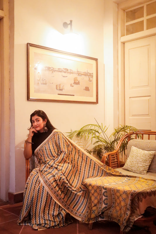 Ajrak Print Modal Silk Sarees- Chakkar Cream