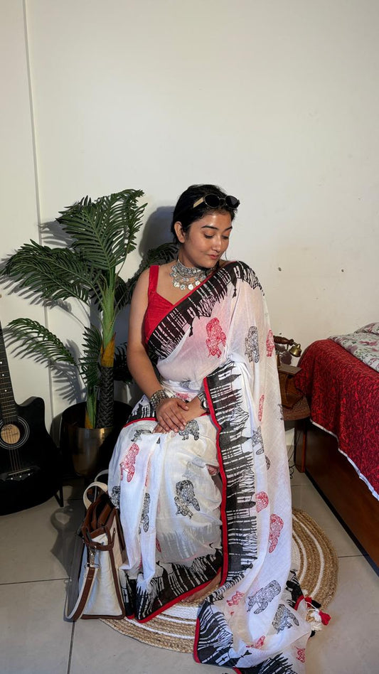 Handloom Mul cotton Howrah Bridge hand block Saree- White