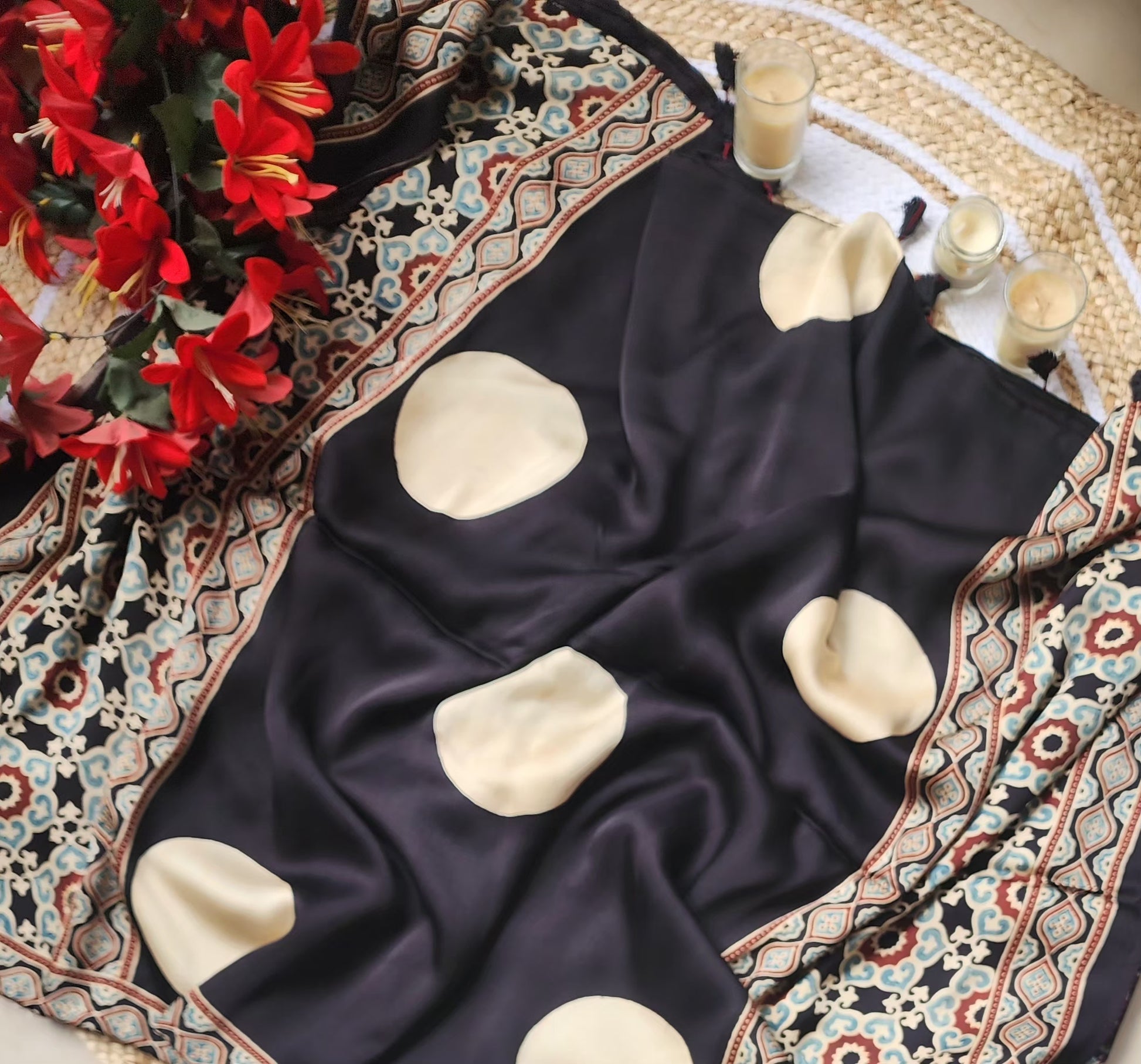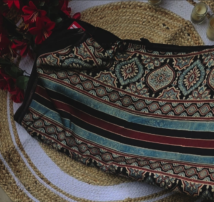 Ajrakh print Modal silk Sarees- Black with white with border