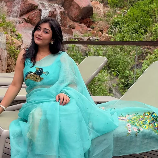 This pure silk organza is bought you from finest silk fabric curated to make organza. This is embellised with handwork of sequence cutdana glassbeads and beads allover carefully crafted by the artisans of India.