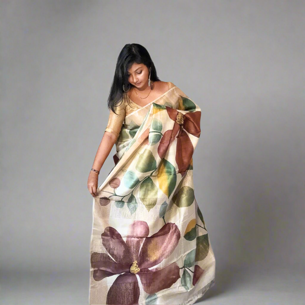 Pure Gachi Tussar Silk Saree- Floral Handpaint